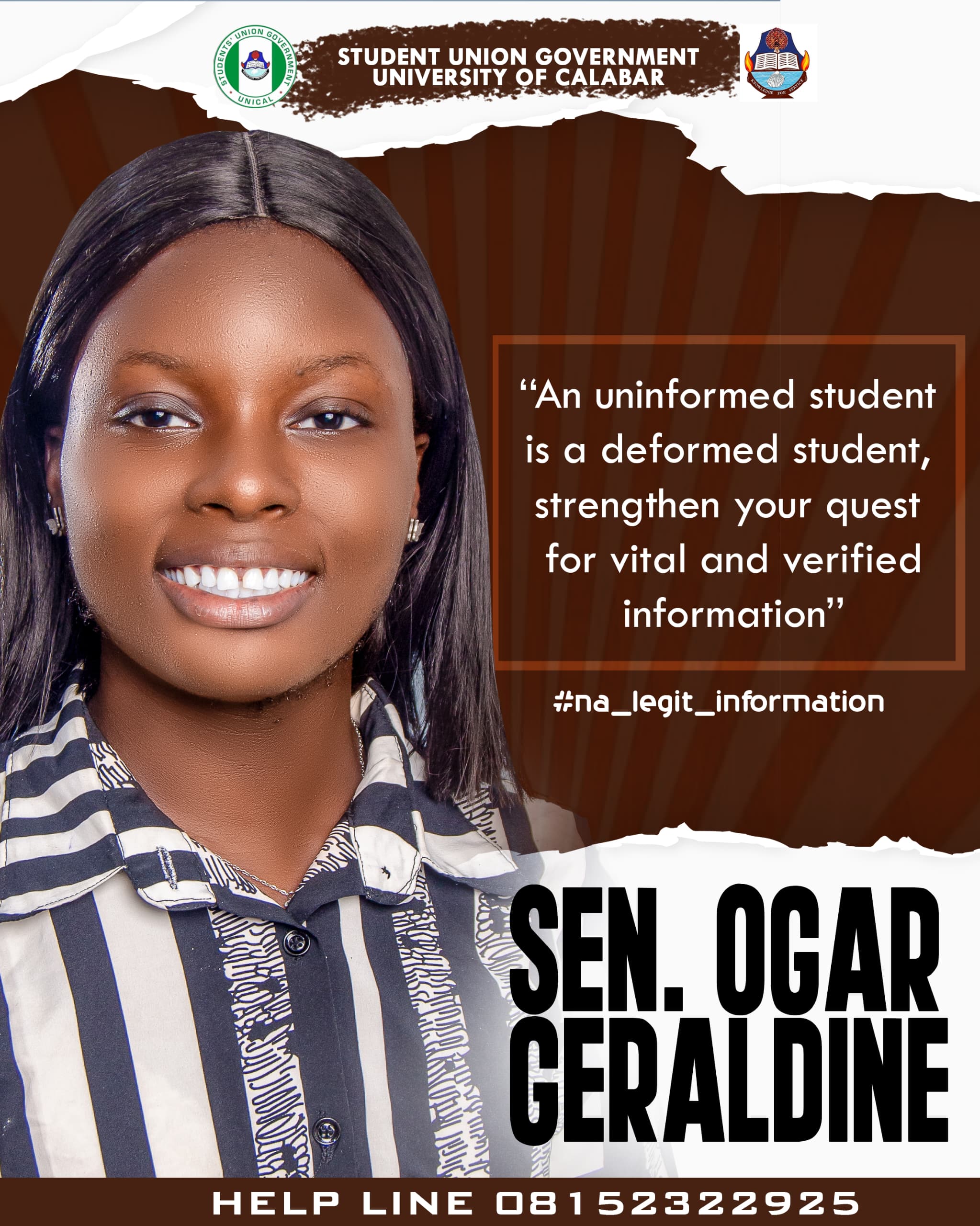 Sen. Geraldine Jenechinghi Ogar contested for the office of Director of Information Student Union Government University of Calabar and won as the First Female to run for such position in the institution’s 49 existence, with a CGPA of 4.12 as at the time.